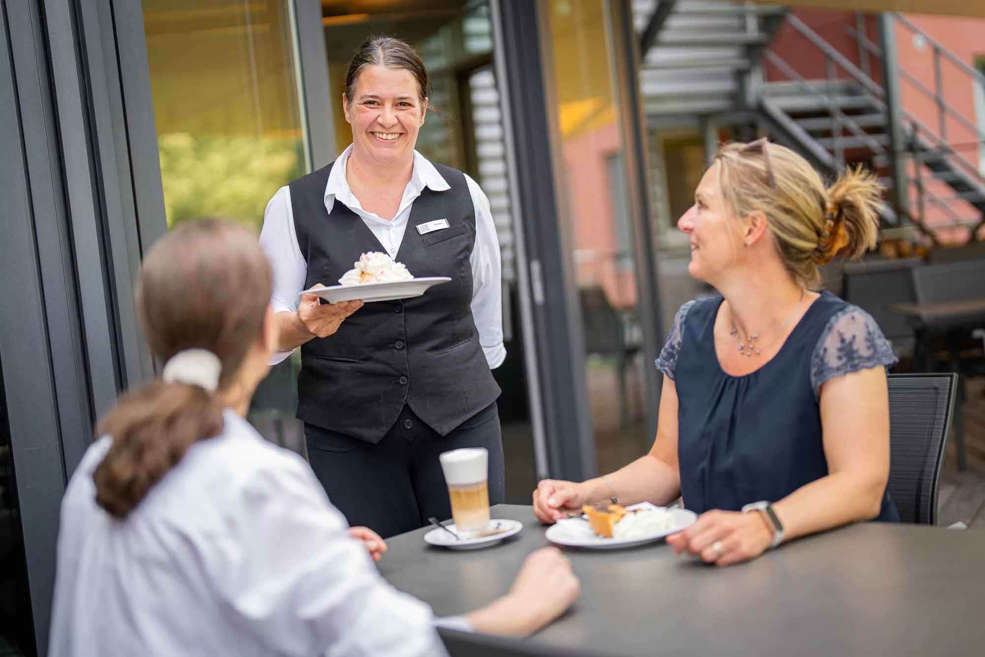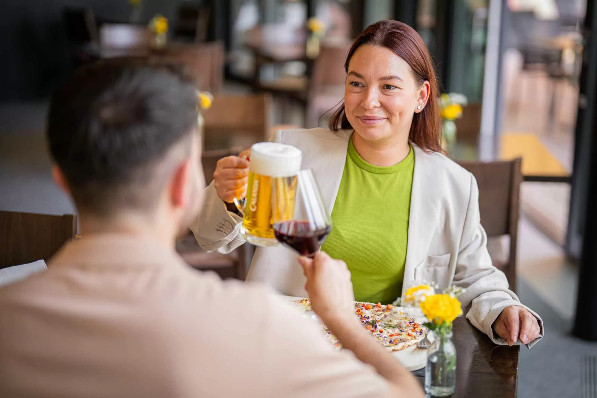 Genuss mit Aussicht. Lassen Sie sich Pizza, Flammkuchen oder ein Glas Wein schmecken – auf der Terrasse oder im lichtdurchfluteten Bistro mit Blick auf die Maienfelder Berge. Platz nehmen, entspannen und den Moment geniessen.
